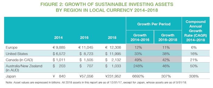 Sustainable investing assets in the five major global markets were $42.77 trillion at the start of 2018, a 34 per cent increase on two years ago – and Australia and New Zealand are the top rated market.