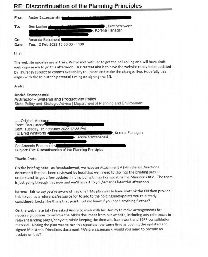 Internally, directions around removing the planning principles and to “pull them down ASAP” was treated as “priority one today” by departmental staff:
