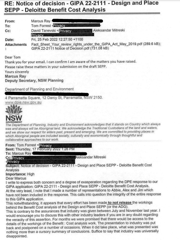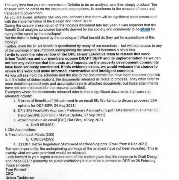 Mr Forrest also filed a NSW GIPA (Government Information Public Access Act) request for documents relating to a cost benefit analysis by Deloitte that showed there was $1.40 of economic benefit for every $1 spent on the DP SEPP.
