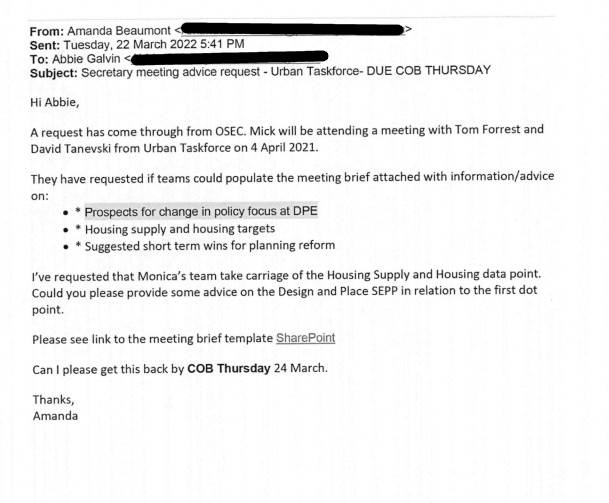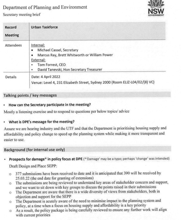 The day before Minister Roberts announced he was scrapping the SEPP, on 4 April, a meeting was held between Mr Forrest from Urban Taskforce and senior departmental officials, including DPIE secretary Michael Cassel: