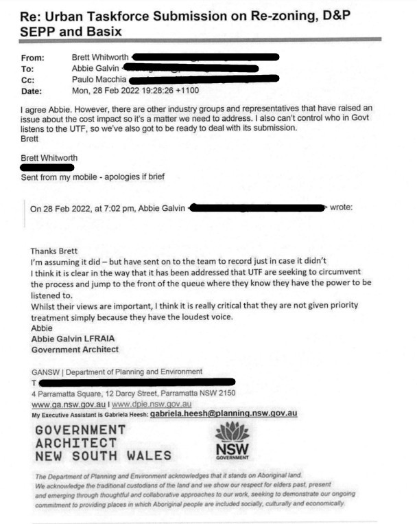 By the end of February, NSW government architect Abbie Galvin was raising the red flag to Mr Whitworth over concerns Urban Taskforce was attempting to “circumvent the process” and “jump to the front of the queue”: