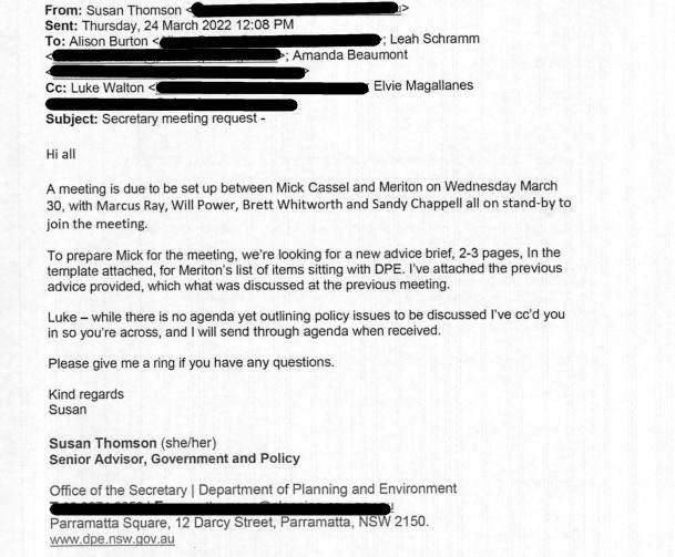 On 30 March – just days before the SEPP was dumped on 5 April – DPIE secretary Mick Cassel, along with a number of other senior departmental officials, held a meeting with Triguboff’s company Meriton: