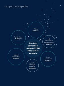 Direct jobs supported by the reef has been estimated at 39,000, mostly through tourism. This is more than twice the number of jobs in the Australian oil and gas extraction industries. Queensland’s coal jobs has also been estimated at just 20,000 and falling.