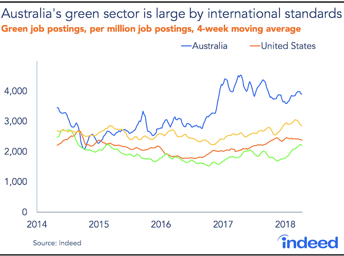 Economist Callam Pickering put together the data, finding that, despite uncertainty around energy and climate policy, demand for green jobs (as a proportion of total job advertisements) was on an upwards trajectory, with Australia ahead of the US, UK and Canada.