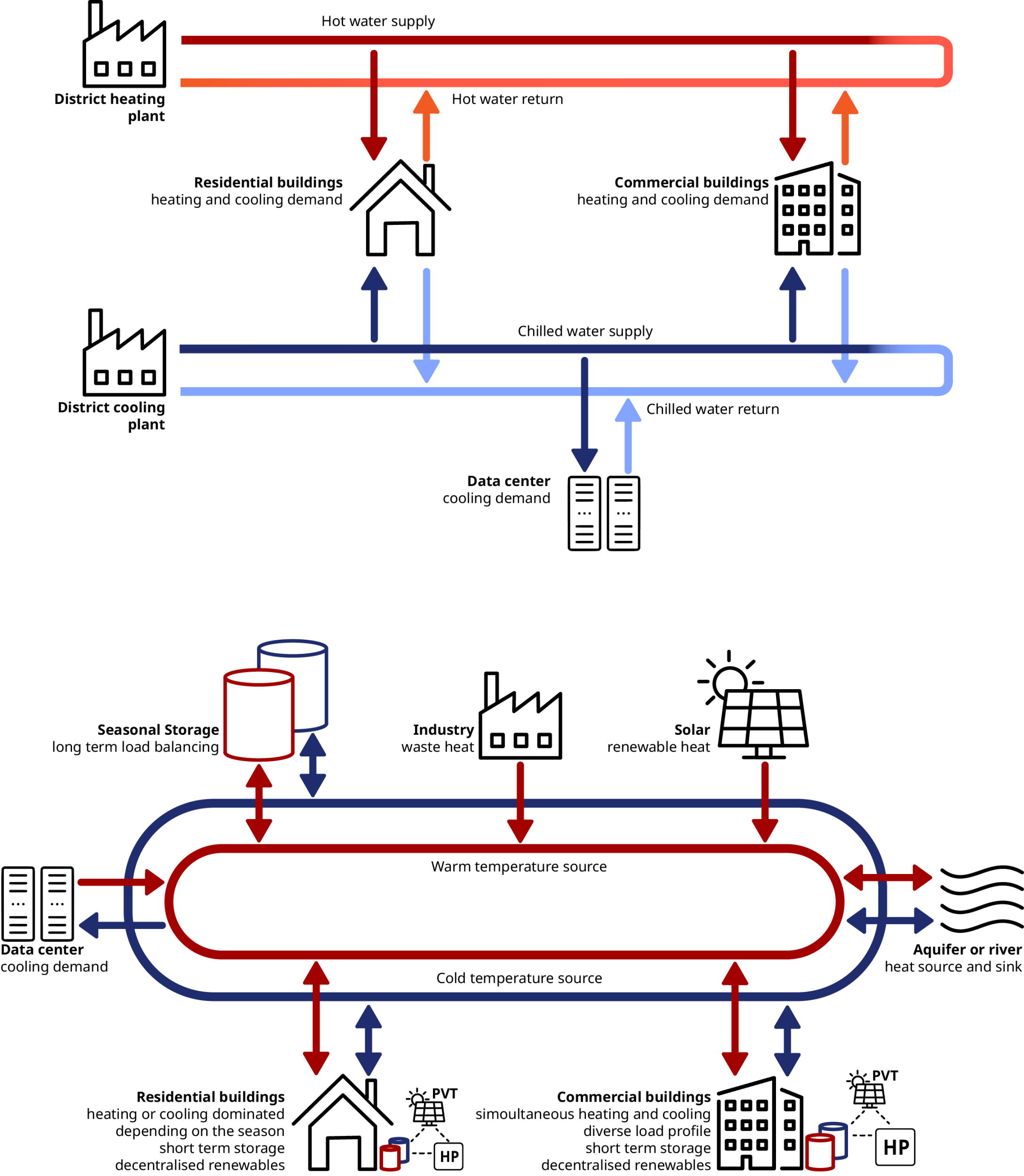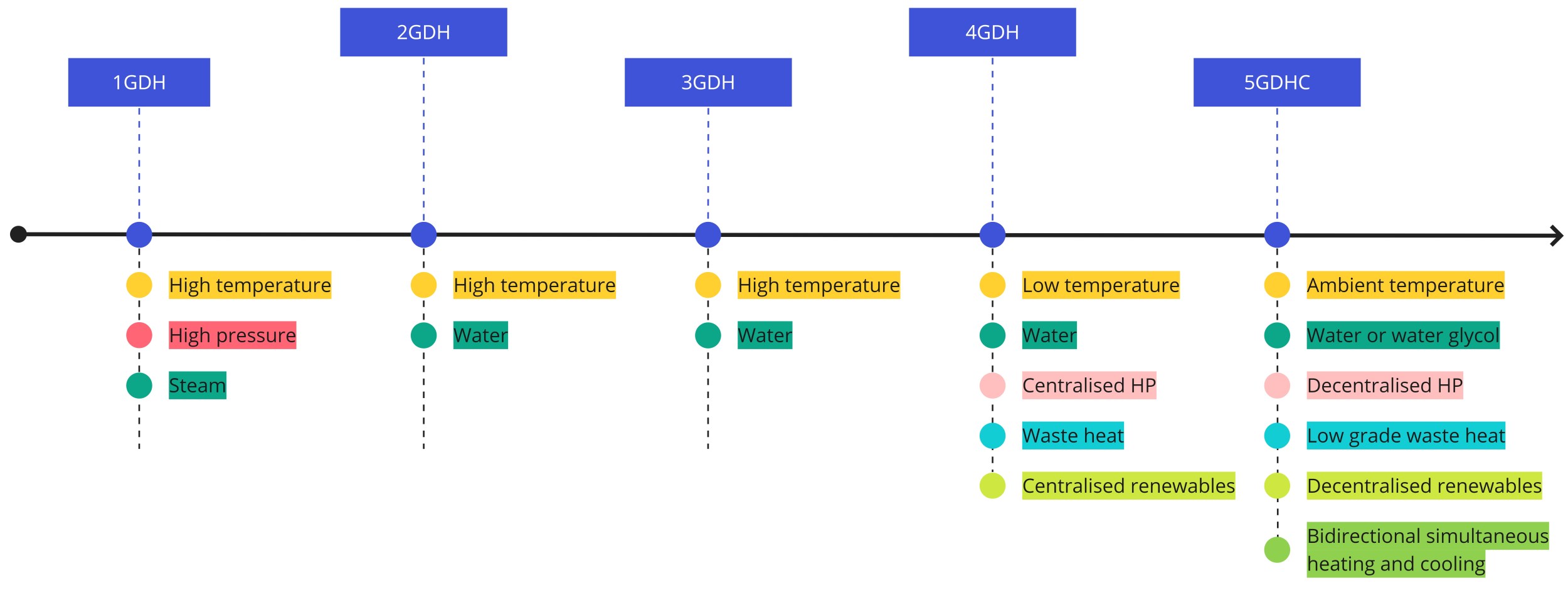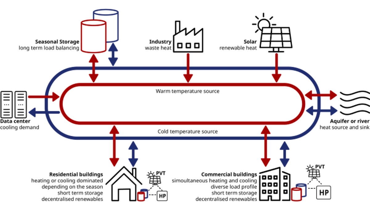 Starting from the architecture, in contrast to previous systems, in 5GDHC there is no single centralised energy source and the water circulating in the network is at near ambient temperature. The effect of this is twofold; first, it decreases thermal losses making the system viable in low-demand density contexts, and second, it makes it possible to integrate low-grade waste heat and renewable sources helping us reach our climate targets.