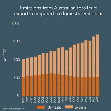 Despite federal government claims that our national emissions have only a minimal impact on the global climate, Australia is, in fact, a major contributor to global climate change. The massive emissions that result from our fossil fuel exports are not counted in Australia’s national carbon budget under our UN climate obligations, nor do we take responsibility for the impact these emissions are having globally.