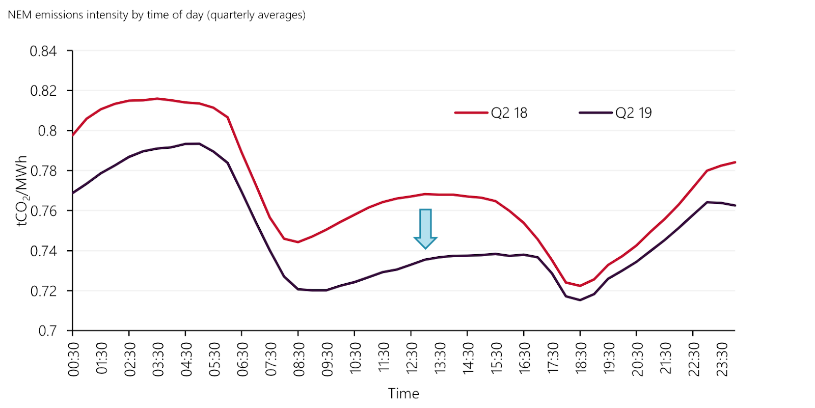 This incredible growth in solar adoption is clearly good news for Australia’s emissions reduction ambitions in the electricity sector. In its latest Quarterly Energy Dynamics Report, the Australian Energy Market Operator reports significant declines in both operational grid demand and emissions intensity, with the largest decrease (in emissions intensity) occurring at midday and credited to increased penetration of solar PV.