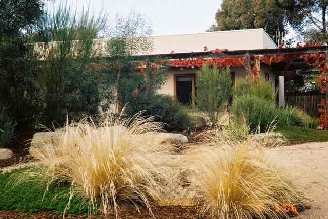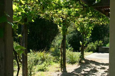 A canopy of green grape vines shades the northern side of each house during the warmer months. In the winter, when the vine leaves have fallen, the sun shines through. Carports and sheds, situated on the west, protect the houses from the worst of the summer sun.