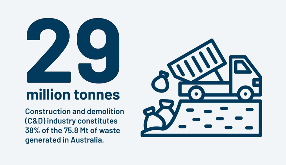 As of today, the construction and demolition (C&D) industry constitutes 38 per cent of the 75.8 Mt of waste generated in Australia, amassing 29 Mt.