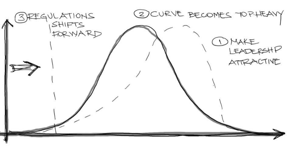 The few who always do the bare minimum would be on the far left while the top performers – the early adopters – would own the skinny top end. Green Star with all its brilliant marketing (kudos to you, Suzie Barnett) would make that end so attractive that the curve would become “top heavy.” In time, that would justify pulling the tail in. I got to make that argument often as the GBCA representative on regulatory task forces.