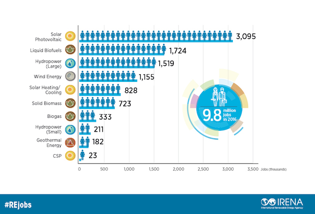 There were 9.8 million jobs in the renewable energy sector globally in 2016, according to the latest report from the International Renewable Energy Agency.