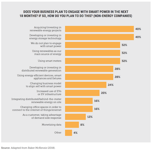 The demand for the energy is a sure bet, with 46 per cent of Australian companies stating they are actively producing renewable energy. However, 32 per cent of businesses surveyed for the report said they had no plans to engage with smart energy such as renewables, energy efficiency technology or storage in the next 18 months.