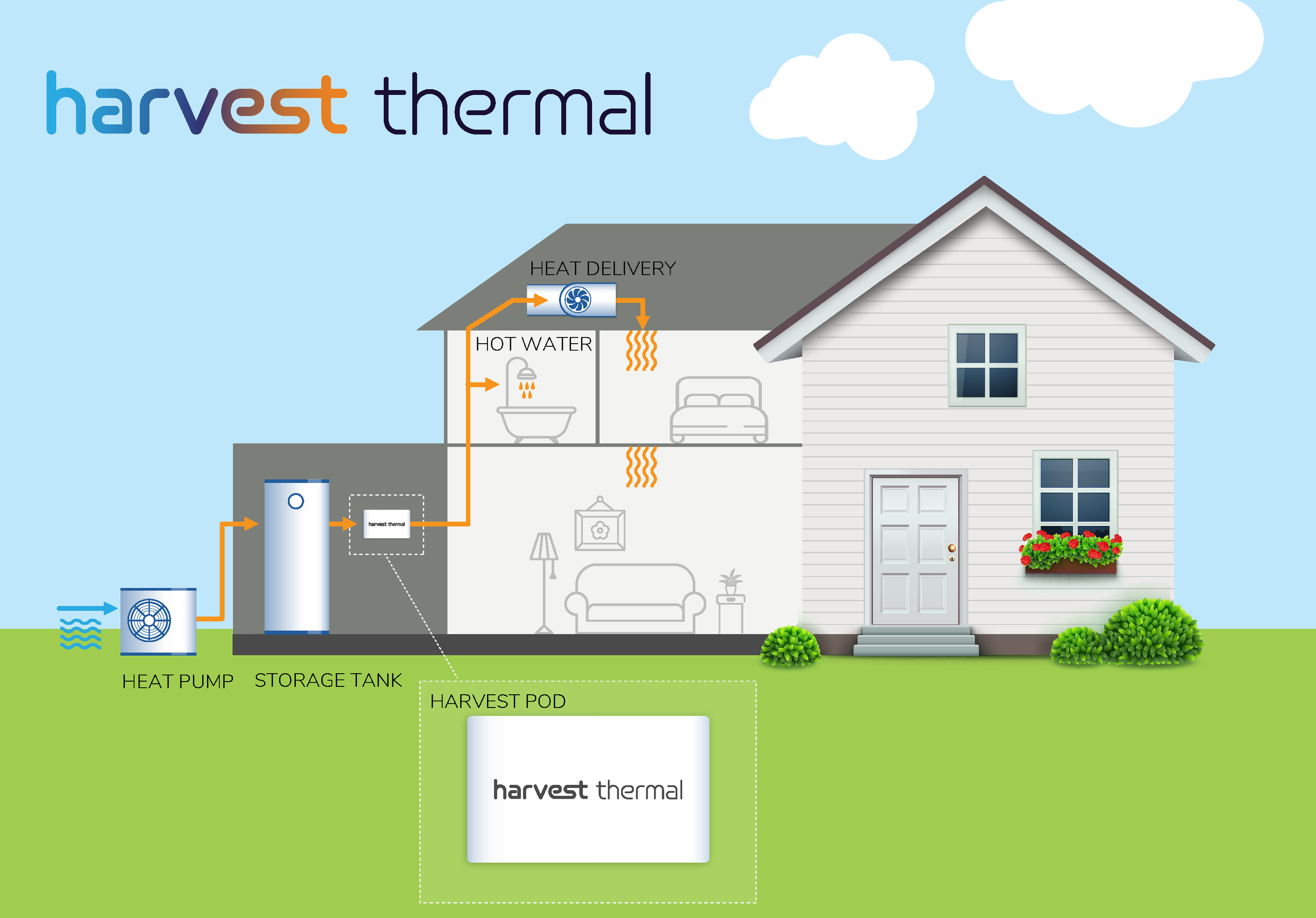 Harvest Thermalโ€™s system works by heating and storing hot water during the day, which can be used for home heating and other needs when demand is highest, at night and in the mornings. The storage tank then acts like a battery.