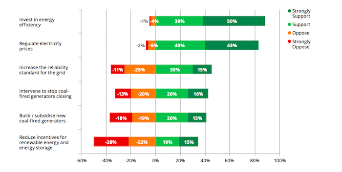 The one area where opposition outweighed support was reducing incentives for renewable energy and storage. Fifty per cent of those surveyed were opposed to this, while 34 per cent were in favour.