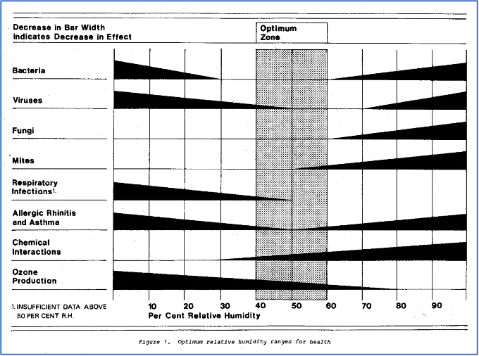 The humidity โsweet spotโ at around 50 per cent RH is illustrated in the classic โSterlingโ chart, published in 1985, with further interpretation of that chart provided here.