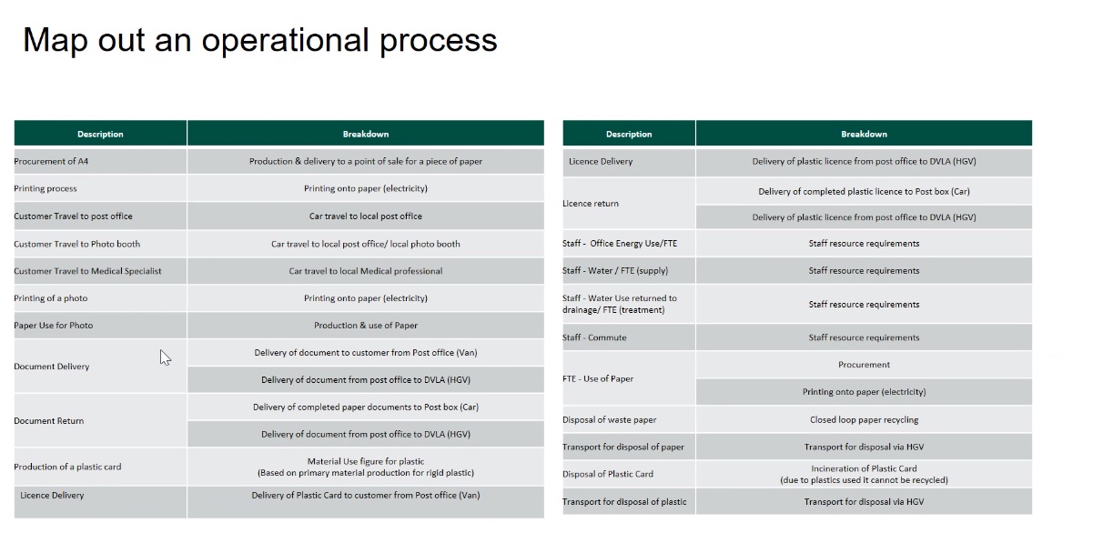 The modelling that DVLA uses looks in great detail at the different stages of these transactions โ the operational processes: from letters being sent out, being printed on different printers, whether the completed forms had to be taken to a post office, how far this journey would be, what type of vehicle might be used for this journey, and for delivering the letters from the post office, with what type of fuels, to the distance the form was travelling back to the main office in Swansea.