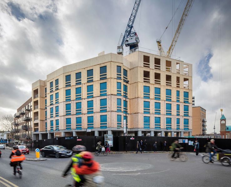 Its latest project at 67–71 Dalston Lane in North London was built with 2000 tonnes of material instead of the 10,000 tonnes that would have been required with concrete construction, not to mention 950 delivery to site that “would have been very nasty”.