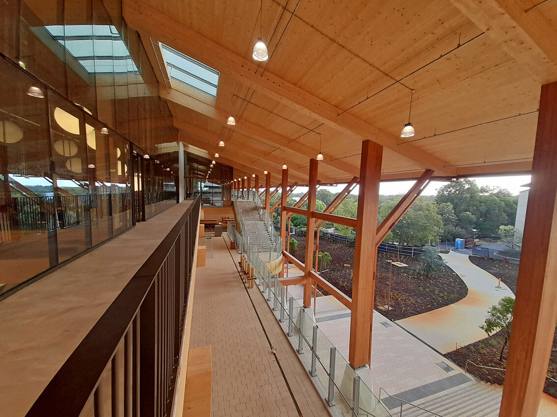 Boola Katitjin: an inspirational and sustainable new teaching and learning building for Murdoch University, creating a new campus centre with 180-metre low-rise mass timber and spaces connected to native bush landscapes. The new campus was named the winner of awards in the โeducationโ and โsustainable buildingsโ category.