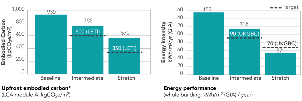 | Upfront embodied carbon LCA module A kgCO2e a sq m | 800 (LETI) | 500 (LETI*) | 300 (LETI) |