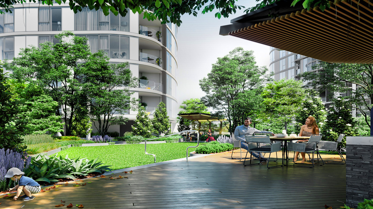 A highlight of the mixed-use development is its 2750 square metre green central public plaza and lush podium-level gardens.