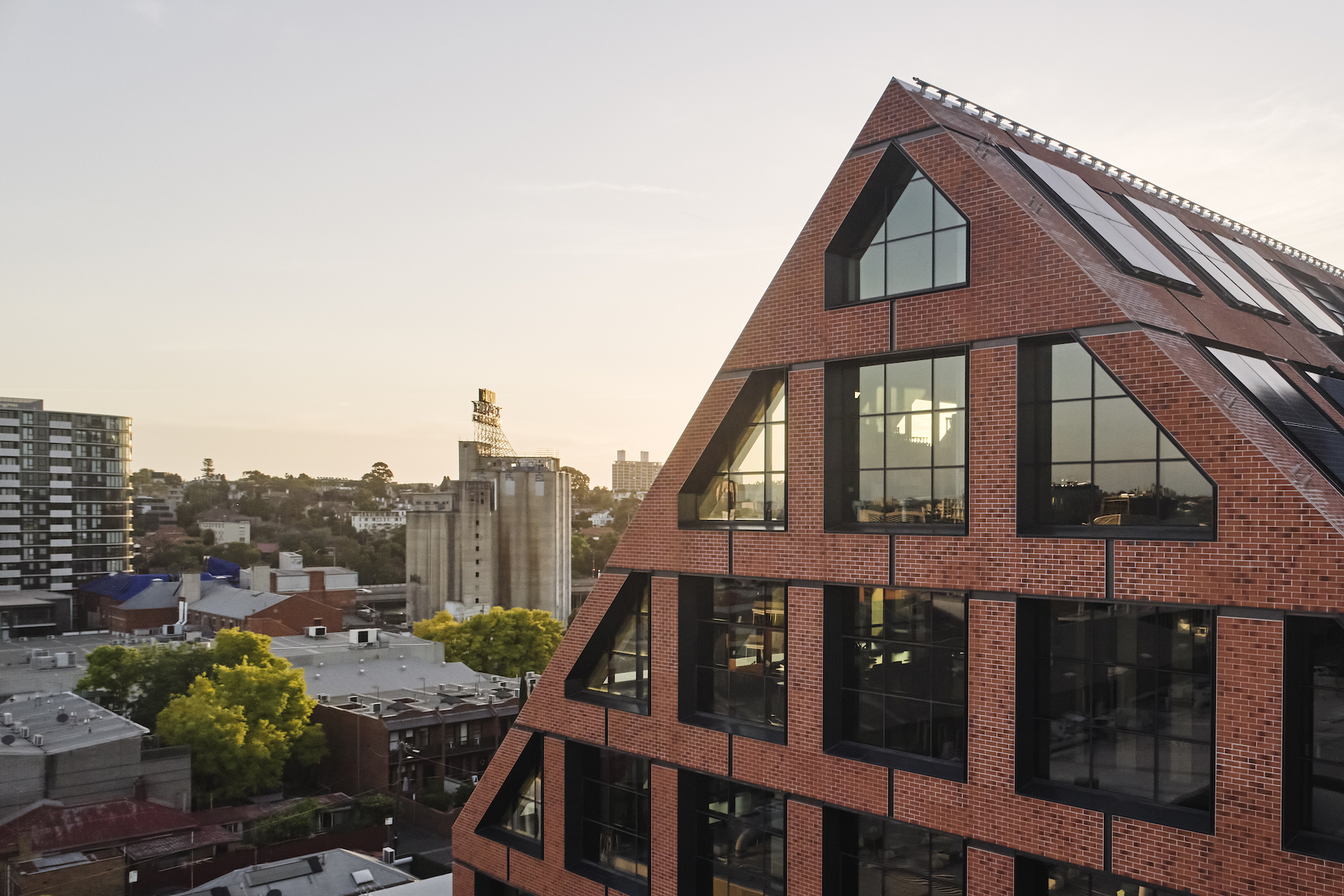 To pay homage to the historical roots of the suburb, Hassell sought to emulate the look of the surrounding warehouses with gabled roofs and corium brick cladding, reflecting local colours and materials. There are large distinctive windows along the sides and “hidden” solar integrated into the sloped roof in the same proportions as the windows. (That’s on the outmoded but still widespread belief that solar panels are ugly. Here’s something much uglier than solar: climate change.) It is certainly a statement.