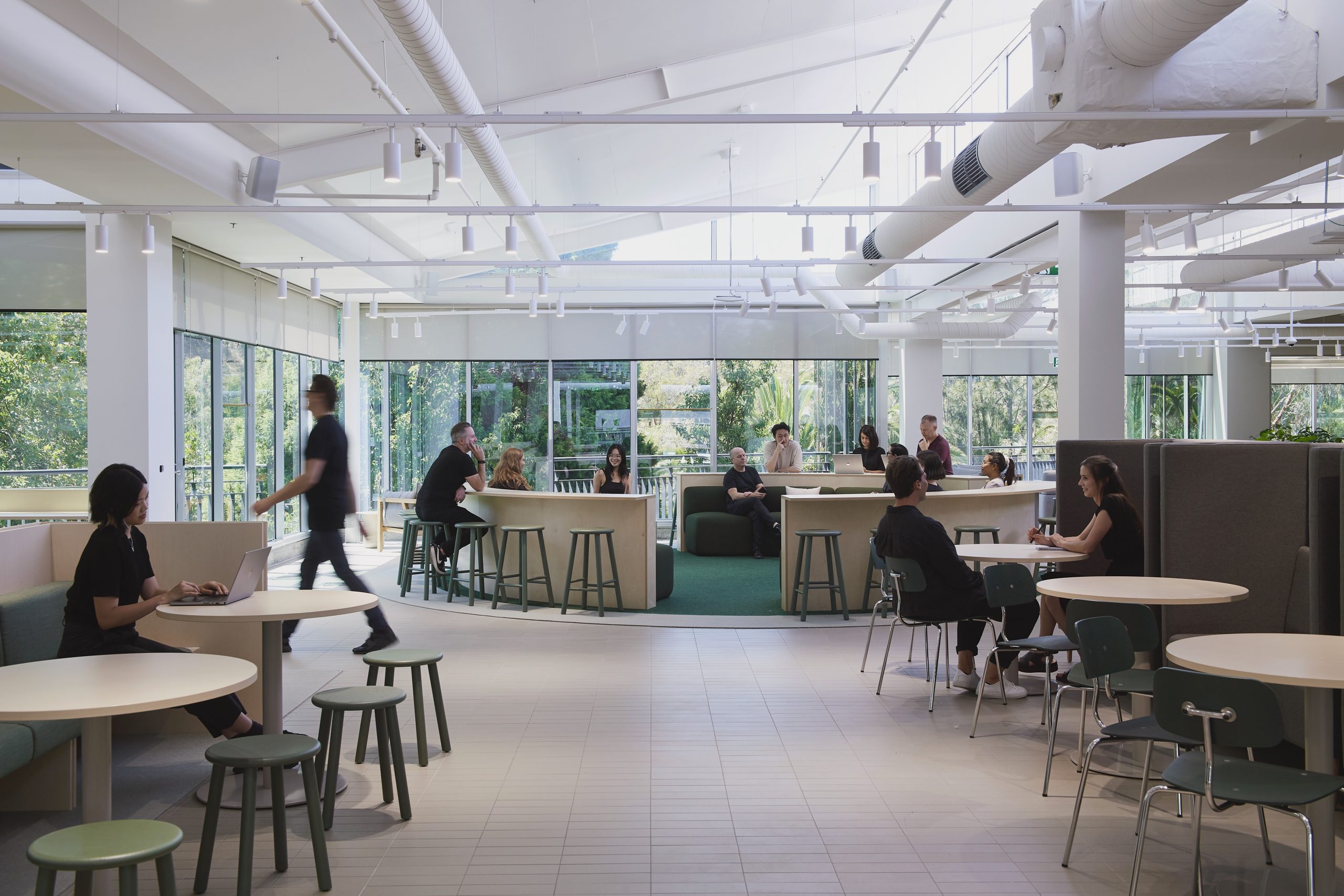 Employees used to arrive to work inside a large and dark wool mill integrated with a 1980s building. The new workplace is across three levels and 7000 square metres, filled with natural light from a large central skylight, and divided into distinct social zones for drop-in working.