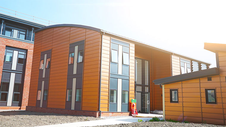 The classroom features a building integrated photovoltaic roof, aqueous hybrid ion battery storage, a novel resistive heating system, and new coatings for steel cladding developed by Tata Steel.