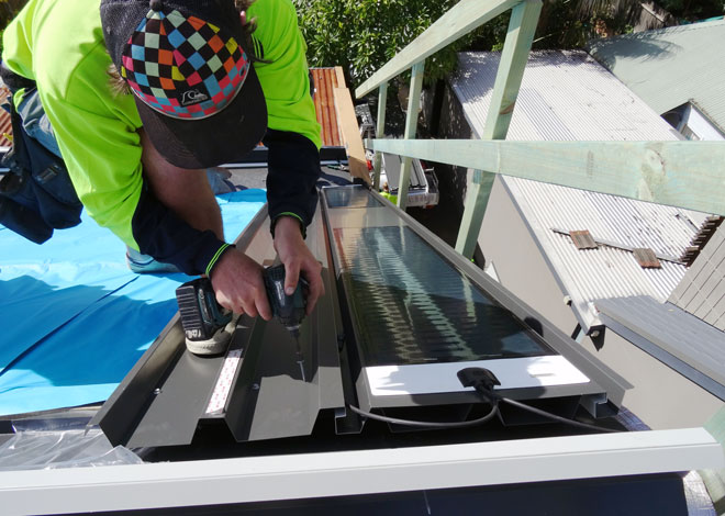 The system, which comprises two layers of steel with the top layer featuring the integrated solar panels, was installed on a rooftop of a renowned architect in Glebe completely replacing an old corrugated steel roof.
