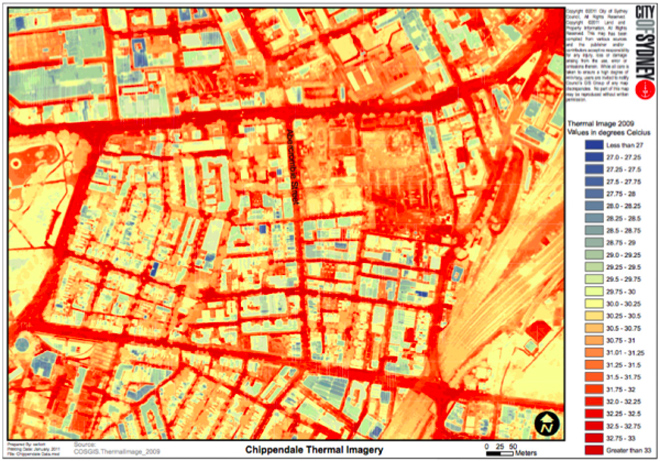 Data has shown that the temperature of roads in Chippendale โ which account for 23 per cent of the suburbโs area โ can be up to eight degrees higher than surrounding areas in summer, meaning discomfort and increased airconditioning costs for those in the area.