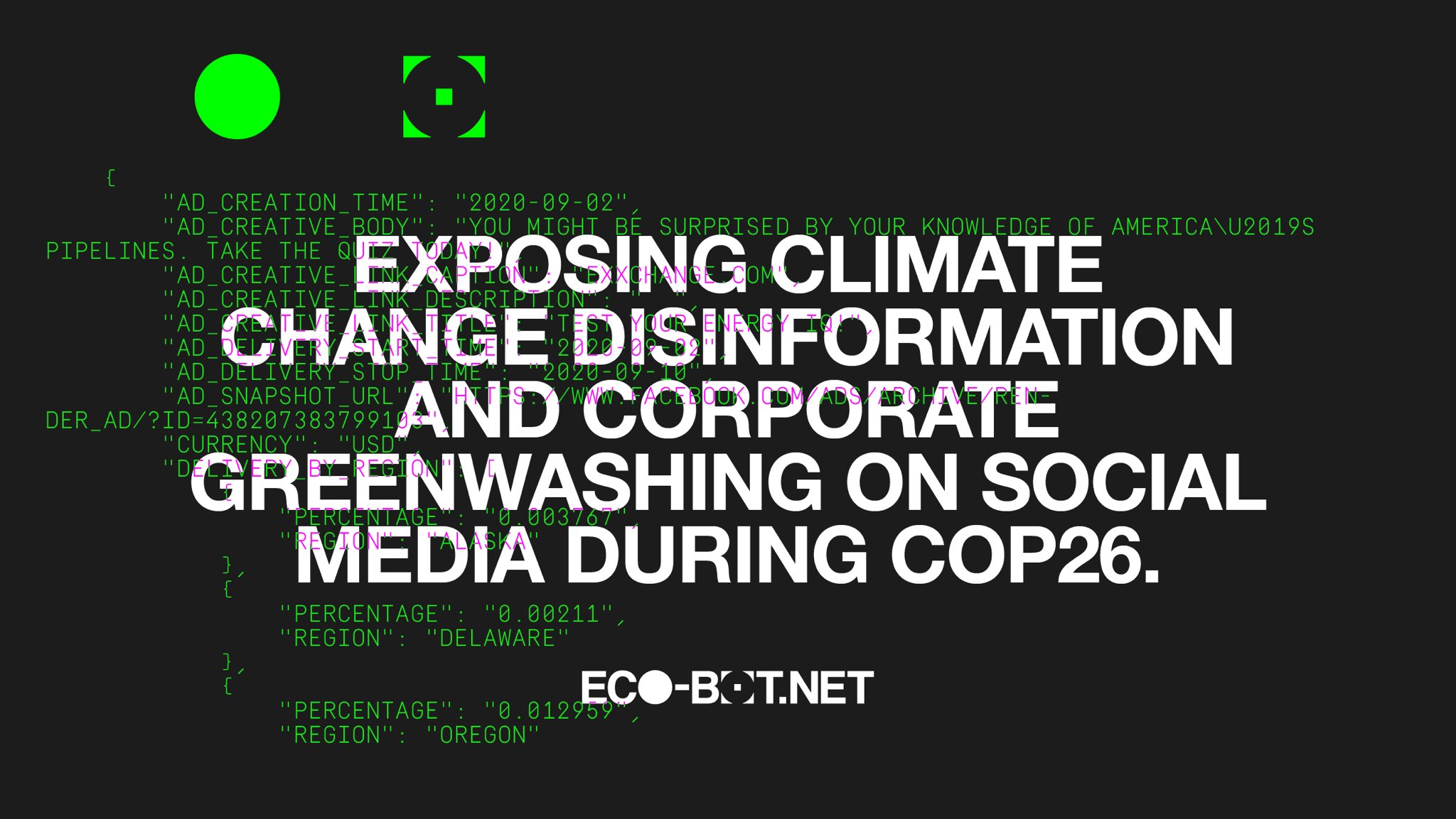 The Eco-Bot.Net system, which is the product of 18 months’ work by UK-based artist-researcher Bill Posters, Robert Del Naja of Massive Attack, activist Dale Vince and a collection of lawyers, journalists, technologists and activists, works by collecting corporate greenwashing ads on Facebook, Twitter and Instagram.