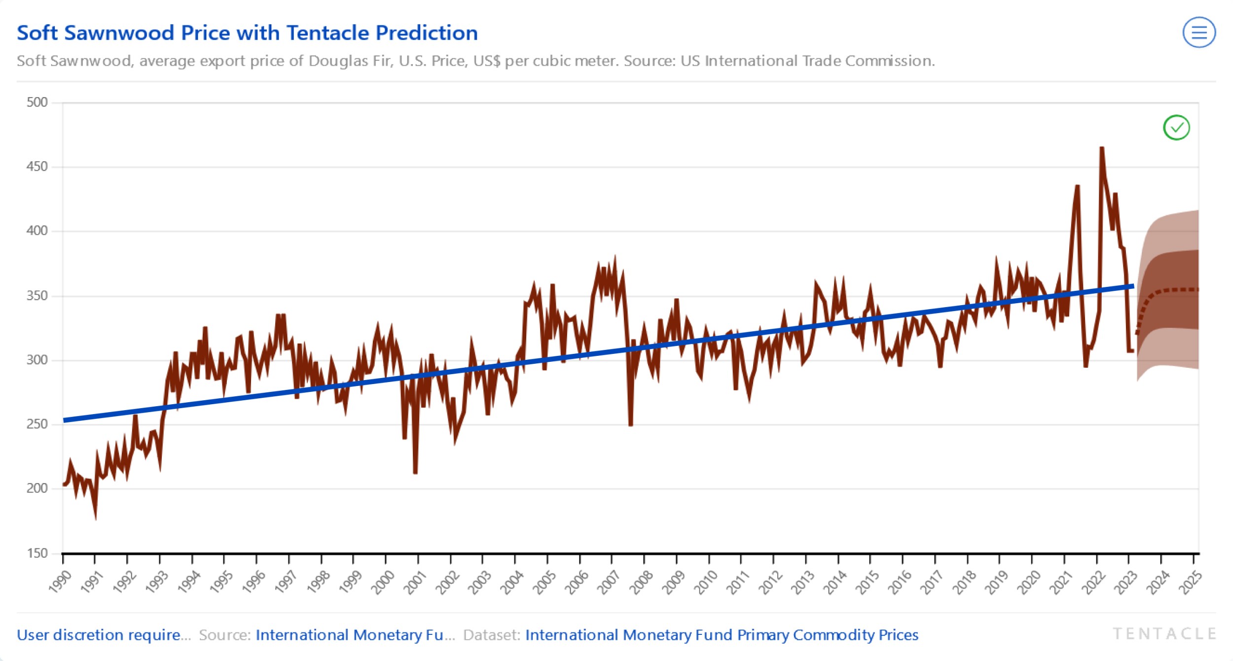 While Australian interest rates rose 10 months in a row to March 2023, to 3.60 per cent โ a typical indicator for housing price growth โ the IMFโs new release of data on April 20 has led to updated predictions of Douglas fir soft sawnwood prices on Tentacle CM&I, suggesting values are set to rise from March 2023 ($US307a cu m) to $US353 in January 2024, when they are expected to plateau until February 2025, providing much needed stability in an increasingly volatile market.