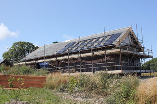 Timber frame house on One Planet Development with reclaimed slate roof and integrated solar panels under construction.