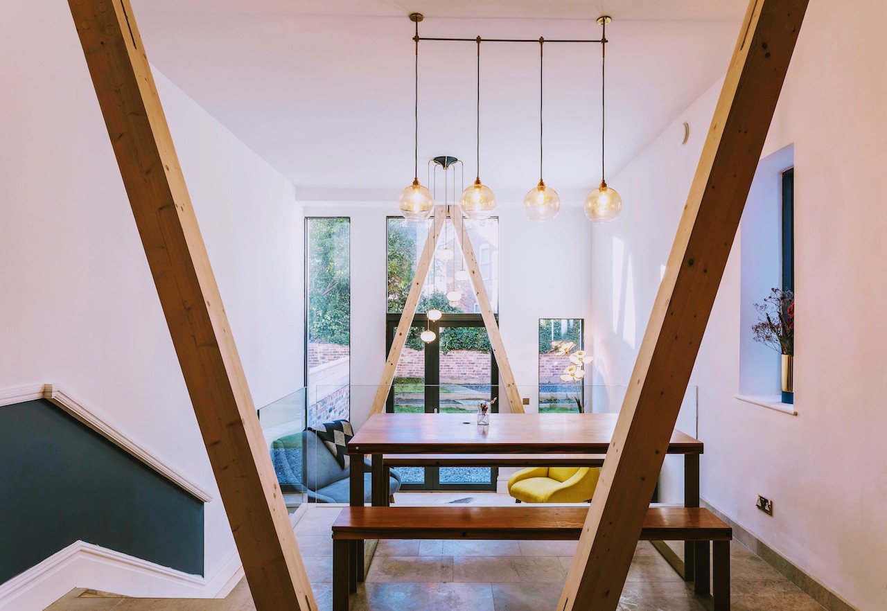 In the four-metre-high rear living area sits a wood burning stove. Although it is not needed to heat the property it does add a little winter luxury. By drawing its air from outside, it avoids the draughts typically caused by chimneys and made worse by lighting fires.