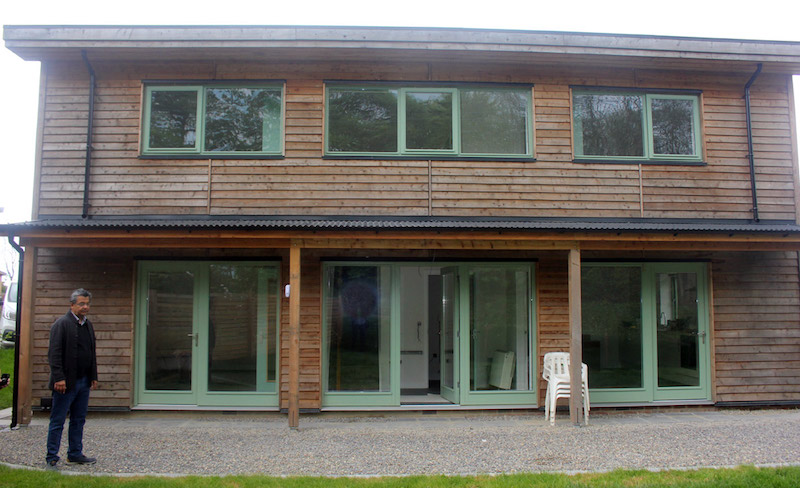 Costs have been kept low and as much as possible of the houses manufactured locally from local materials. In total 80 per cent of the building is manufactured locally out of local timber and 40 per cent โ the airtight frames โ are manufactured in a nearby factory โ a converted cowshed โ to be assembled on site.
