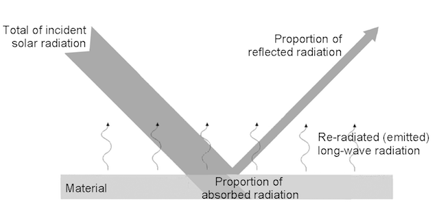 Direct benefits to individual buildings occur by reducing absorbed shortwave radiation through the roof. Neighbourhood-scale indirect benefits result from reduced ambient air temperatures, particularly when high-albedo surfaces are deployed on a large scale.