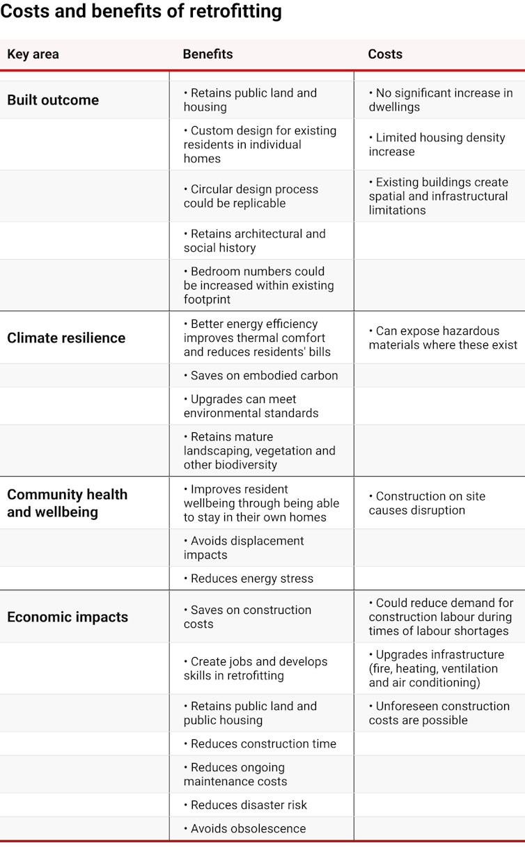 So, how should decisions on public housing account for environmental, social and economic costs and benefits for all the people and interests involved? We draw on our recent research on life-cycle impacts and public housing tenant relocations to answer this question. Our research shows decisions on each tower that are underpinned by a proper process – one that considers all the evidence – could go either way: demolish and rebuild, or retrofit.