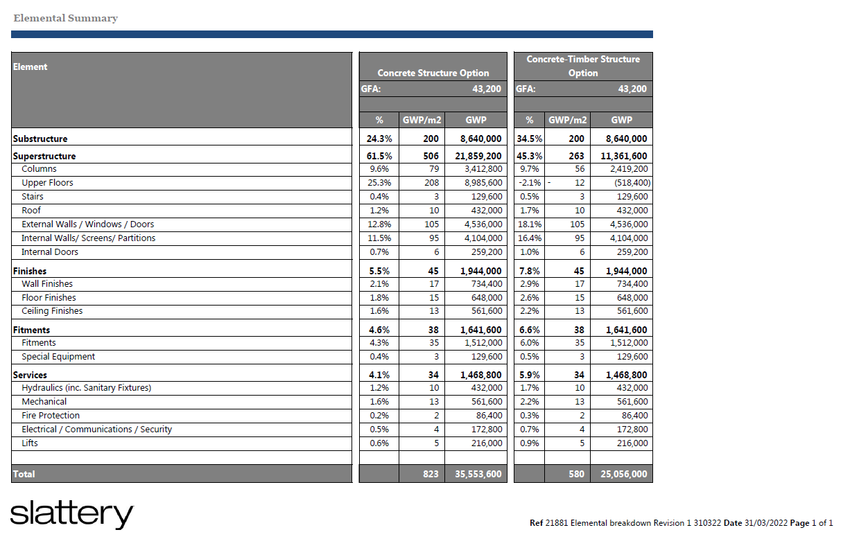 “It’s a comparison of cross-laminated timber and a hybrid build as opposed to concrete and steel, and as per the Slattery Carbon Accounting, this demonstrates a saving of 10,497,600 kg/ CO2eq,” Dibble said.