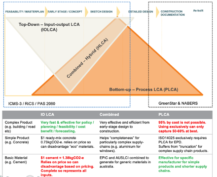 Buildings and infrastructure are complex assemblies of thousands of products, that often take three to five years to build. Different approaches to measuring must be incorporated in different ways throughout the project to maximise carbon savings – starting at the business case. There are also different LCA methodologies that apply at the material or product level versus whole of building.