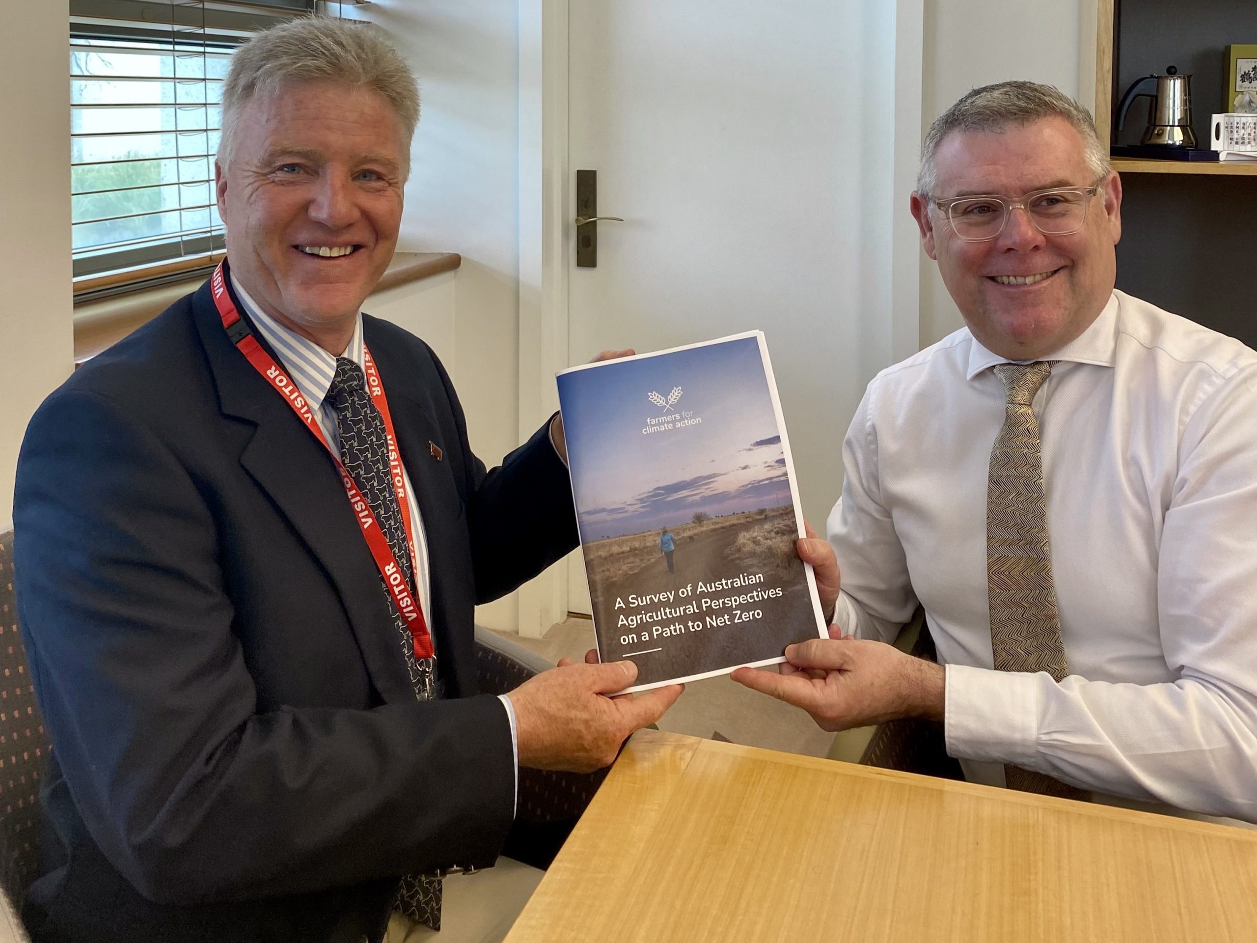 Farmers for Climate Action Chair Brett Hall hands the farmer survey to Federal Agriculture Minister Murray Watt