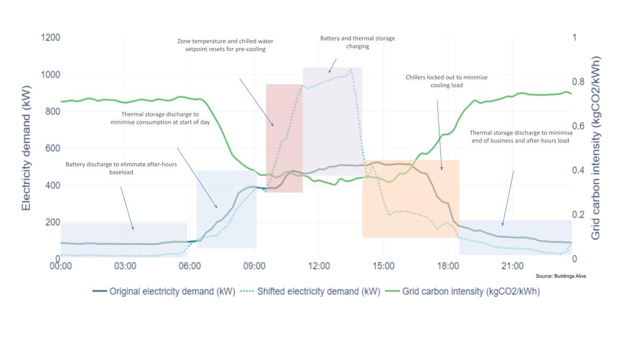 - Early the next morning most of the remaining energy in the TES and BESS is discharged to maximise the building’s capacity to draw energy from the grid again, and then the cycle is repeated.
