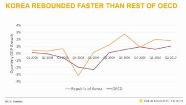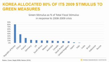 South Korea was one of the few countries to show positive growth early on in 2009-10. This is because it invested in sustainable forms of transport and green infrastructure. For example, it increased the subsidy on solar rooftops up to 50 per cent of their cost. As a result, economic recovery and job creation was twice the rate of other countries for the same amount of fiscal stimulus.