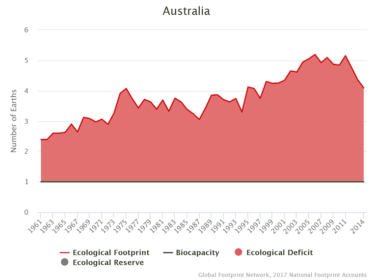 Australia is using the resources of 4.09 Earths, down from a peak of 5.15 Earths in 2011.