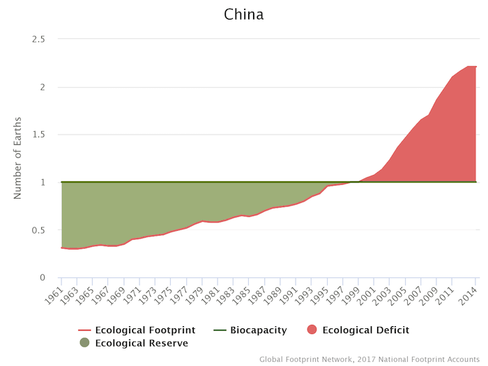 Biocapacity is also shrinking quite rapidly per person, so even though per person ecological footprint has not changed that much, its ratio to biocapacity has become ever more unfavourable.