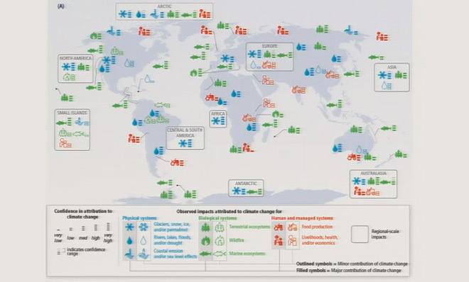 A map was released with the report, showing the effects of climate change already suffered around the globe, including physical systems, biological systems, and human and managed systems.