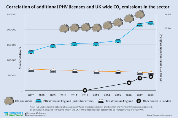 In London, Paris and Brussels also, an increase in measured overall transport emissions corresponds to the increase in registered Uber-type drivers.