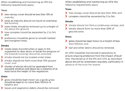 Maintaining IPAs and OPAs to those standards should be ongoing and in perpetuity. Compliance can occur through the development enforcement procedures. However, lack of maintenance of APZs is a significant factor in property loss during bush fire events.