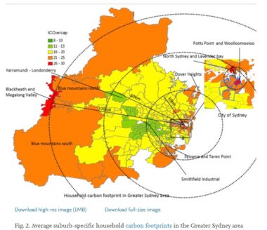 Yet, when income levels rise in the not-so-far Blue Mountains, where population density is low, the carbon footprint is above 20 tonnes CO2e/cap (see figure).